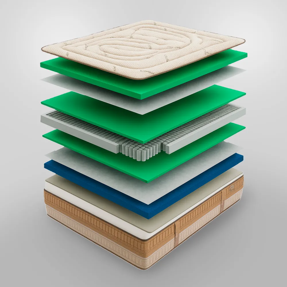 Como este colchón es de doble cara, se le incorpora otra capa de espumación Greenfoam de 30mm, otra capa de tejido de microfibra transpirable y finalmente una de tejido Strech 650g.